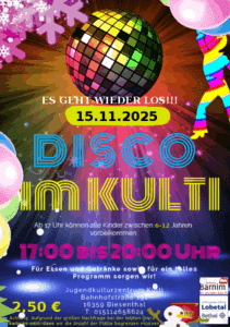 Feiert mit uns eine coole Kinderdisco am 15. 11.2025 im Jugendzentrum KULTI! Euch erwartet eine tolle Party mit heißer Musik, cooler Deko und jeder Menge Tanzspaß. Kommt vorbei, schwingt das Tanzbein und feiert mit euren Freundinnen. Ob aktuelle Hits oder eure Lieblingssongs – für jeden ist etwas dabei!