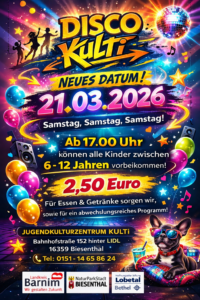 Feiert mit uns eine Kinderdisco am 21. 03.2026 im Jugendzentrum KULTI! Euch erwartet eine tolle Party mit heißer Musik, cooler Deko und jeder Menge Tanzspaß. Kommt vorbei, schwingt das Tanzbein und feiert mit euren Freundinnen. Ob aktuelle Hits oder eure Lieblingssongs – für jeden ist etwas dabei!