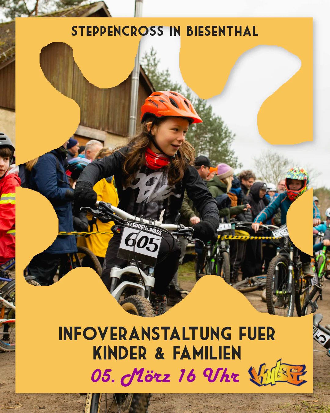 Infoveranstaltung für Kinder und Familien zum Steppencross05. März // 16 UhrKULTI Biesenthal // Bahnhofstraße 152 hinter LIDLNicht mehr lange bis zum Steppencross! Wir freuen uns wieder unzählige Kids am 14. März in der Wokule begrüßen zu können. Es gibt nicht nur jede Menge spaßige Aktivitäten am Rand sondern auch Kinderrennen für verschiedene Altersklassen.