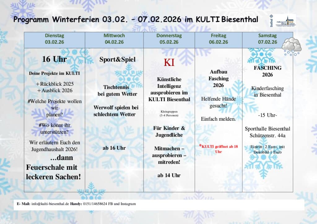 In den Winterferien erwartet euch im KULTI Biesenthal ein abwechslungsreiches Programm für Kinder und Jugendliche: Gemeinsam planen wir neue Projekte, treiben Sport und spielen, probieren Künstliche Intelligenz aus und bereiten den Kinderfasching 2026 vor. Den Abschluss bildet der große Kinderfasching in der Sporthalle Biesenthal.